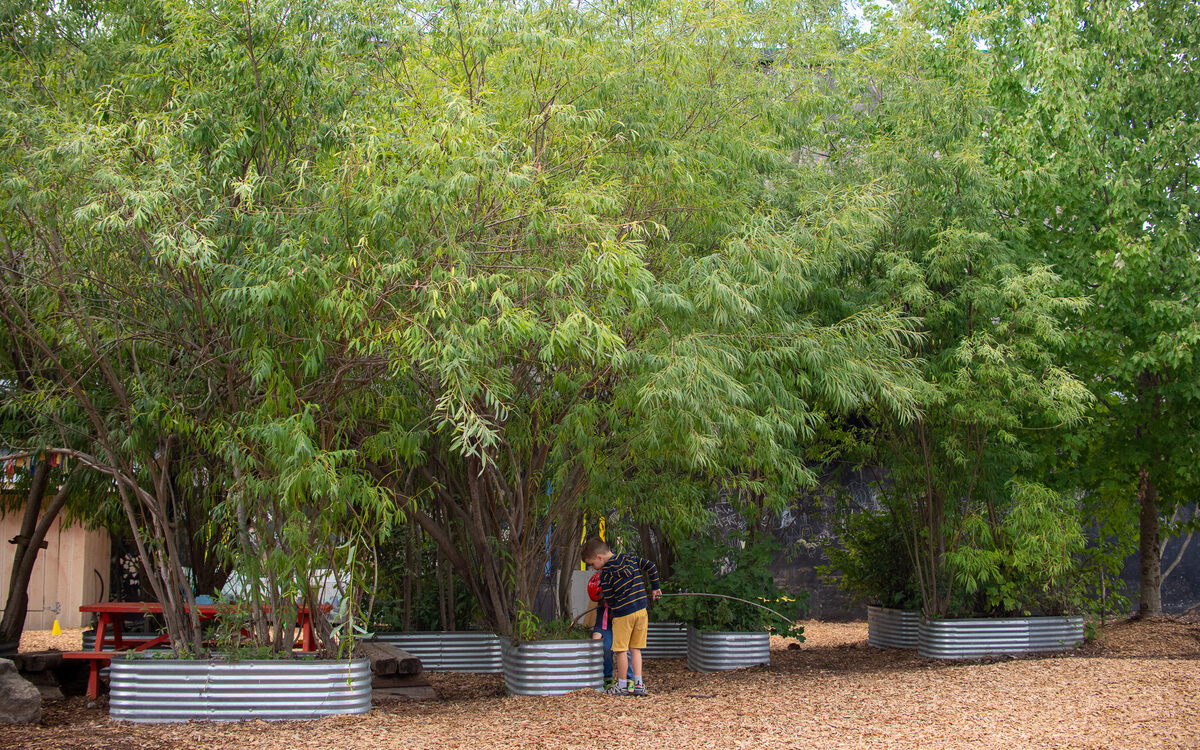 The Willow Dome is a shaded, quieter spot in the garden where children can gather to read, do crafts, or simply enjoy some calm time. Its tall willow branches are woven into a dome structure, creating a peaceful space for reflection and rest.