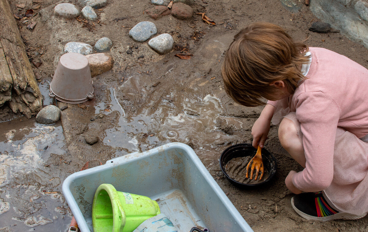 Prompts for play: How many fossils can you spot, and what do they feel like? What ingredients can you gather from nature this season? What kind of dessert could you make with them? How many mud creatures can you shape and bring to life?